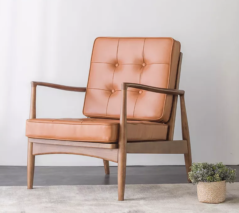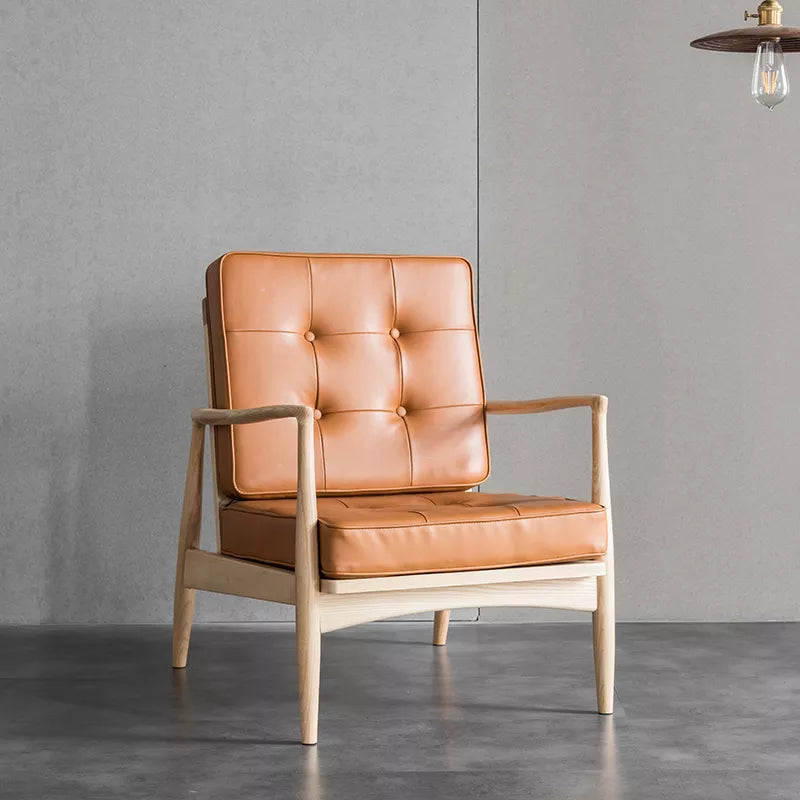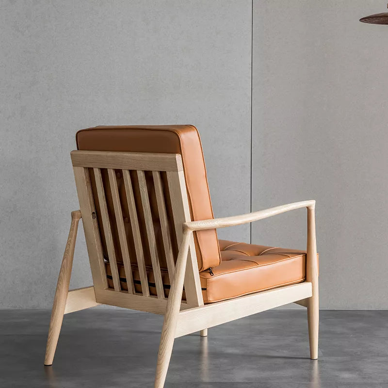 Enjoy comfortable lounging with this mid-century modern Danmer Armchair. It is handmade from North American Ash wood, upholstered in luxurious leather, and its natural ash or walnut wood finish adds to its timeless look.