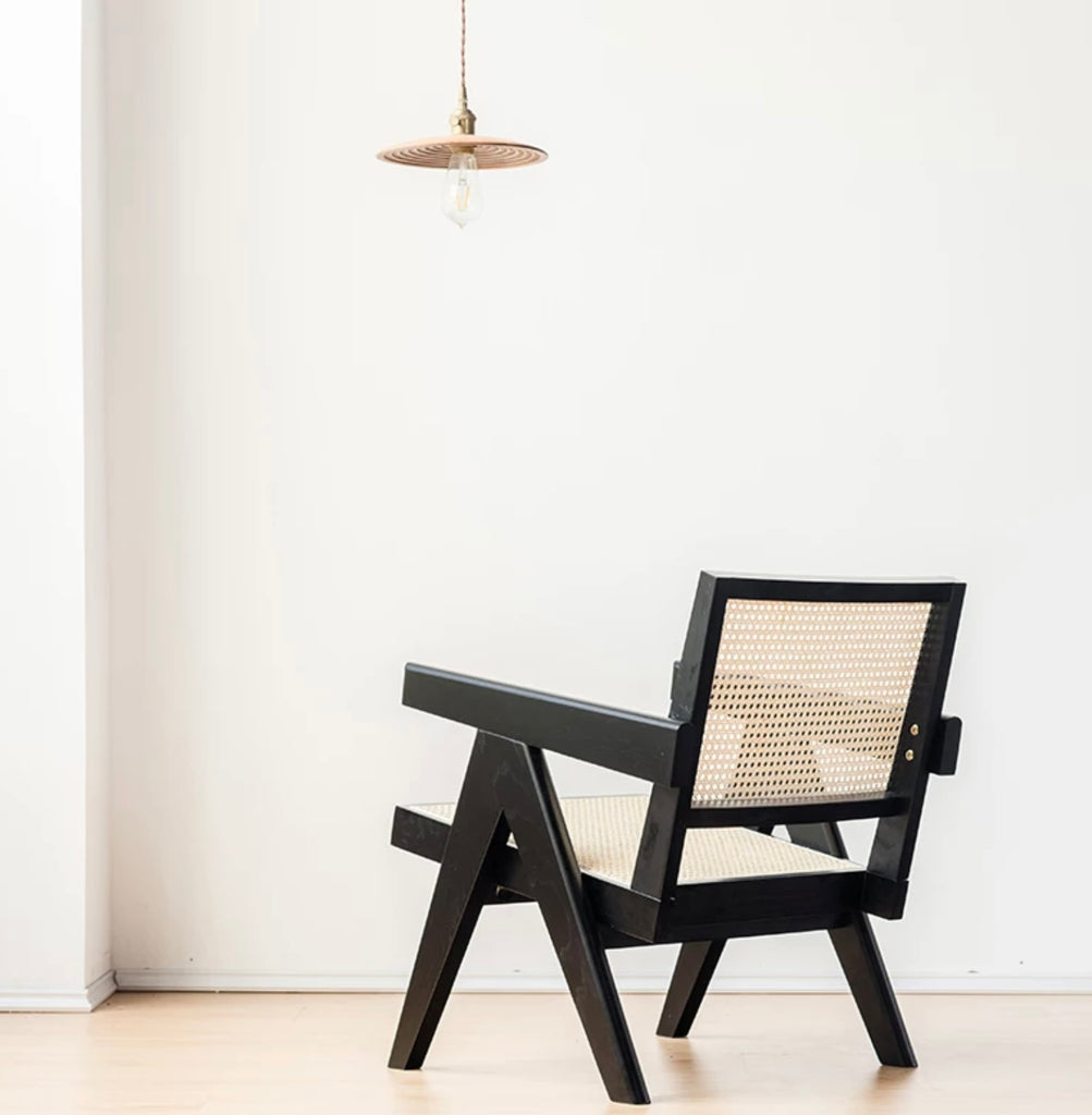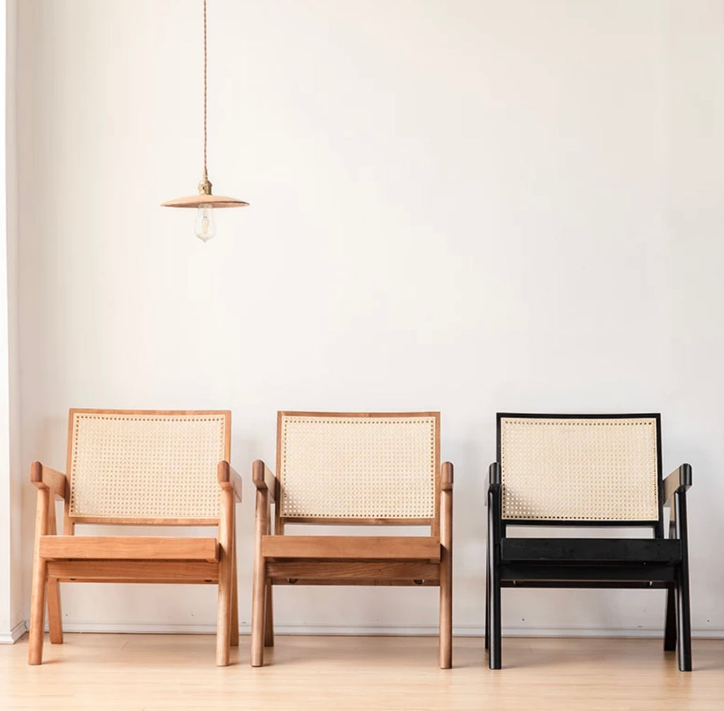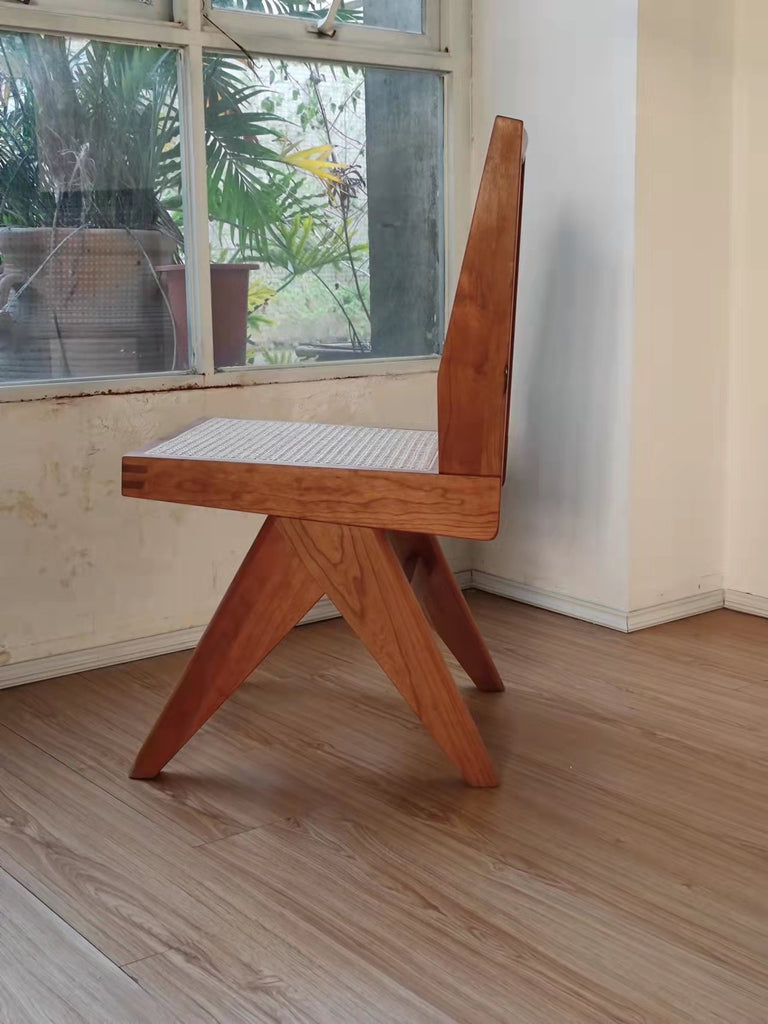 Inspirado por la icónica Pierre Jeanneret Fácil silla, este hermoso marco de madera de cerezo estadounidense, apoya un respaldo y un asiento de rattan de caña natural.